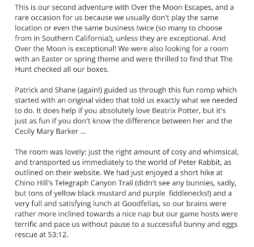 There were a ton of props (to take photos with later!) and a lot of red herrings but we got out in 39:13, faster than our trip up on the freeway! The escape included unlocking ourselves as well as answering some questions at the end of our game, but we were so taken with the room, we completely forgot the questions. Our favourite puzzle had to do with the piano and the masks, and we are not sure what to think about the automated hints and prompts. On the one hand, everything was made very clear, but on the other, it seemed like we were not really playing with a real-person gamemaster. We were a little surprised when Shane showed us out, but it must have been a shift change. It felt a little rushed, but since there was no timer inside the room, we didn’t realise we made it out in less time than it would take for them to put the room back together for the next group! Shane took a really good photo for us, on their camera that they e-mailed later with our real time and who else finished before us, so no complaints! 4.5 stars rounded up. Really looking forward to checking out Peter Rabbit at Easter!