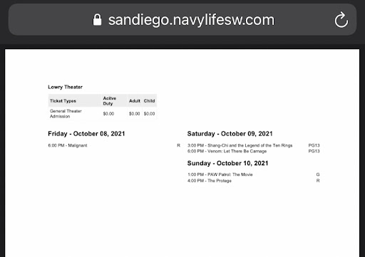 This is a huge theater that shows current movies for free for active duty military in their dependents, as well as anyone with access to the base. Their website shows the current showings and times (super basic).