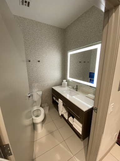 When looking at the room, it looked pretty modern and new until I decided to use the bathroom. The door would not close. It seemed like the door was too large for the opening. The toilet paper roll holder was installed crooked and the roll was too big so it fell off. The paint was chipping off. One wall looked like part of the drywall was ripped. The tiles on the wall by the floor were cracked and the caulking along the wall looked grayish black like mold. The sprinkler head on the ceiling was rusty. The counter had some stains and streaks like it was cleaned quickly. The shower head had a film on it and the bathtub had more than one ball of hair in it. The overflow cap on the tub was rusted. The shower did have a shampoo and bodywash pump, but no conditioner. I took a bath first and you need to be careful because the hot water is scalding. I took a shower and couldn't get the tub faucet to stop flowing completely while using the shower head. There were plenty of towels to dry off, but I was definitely paranoid at this point about whether or not they were clean or just folded back up. There was a hair dryer under the sink which is convenient, but I didn't test it out.