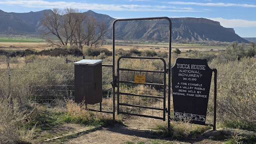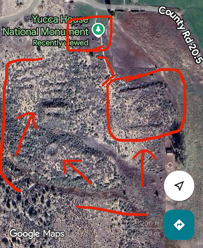 There is a guest book at the entrance fence but no paperwork, BUT if you go to the Mesa Verde visitor center they have an info sheet and a passport stamp for Yucca House. Though the only visible feature is an exposed wall that was excavated and stabilized in the 60s, the rest of the compound is covered by vegetation and more apparent via Google Maps aerial view (select features in red).