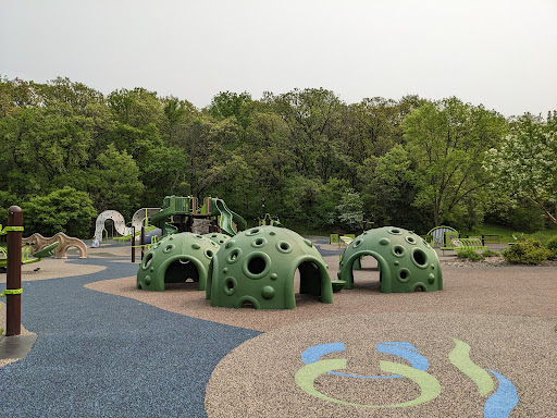 Here's what you need to know: Parking: Lot Age range (playground): 1+ Sidewalks: Paved to park amenities and throughout park grounds Seating: Ample seating throughout play area Bathrooms: Located in warming house Picnic tables: Enough to seat around 50 in a picnic shelter to one side of the play area Grills: NA Sports field: See website for a complete list