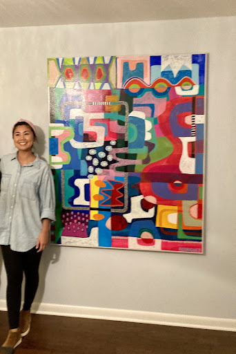 Marianne was even more charming and personable in person than she was on PBS. She has Filipino roots and has lived literally all over the world. She is attracted to unique shapes and colors which she boldly uses in all of her magical pieces. Her artistic confidence is very apparent. We explored her gallery. We met her husband Rock. We were introduced to her adopted kitties. My eyes landed on a very large canvas. Was this piece for sale? Too big for my condo? Which wall? I was told that it was for sale. My friends assured me that the piece of art would be perfect. In what seemed like a split second, I bought it. Since we all were flying back to Ohio in a few days, later that afternoon after the gallery closed, Rock and Marianne installed my new purchase. With them doing this, we then had some time to get acquainted with the new piece of art in my condo before heading home.