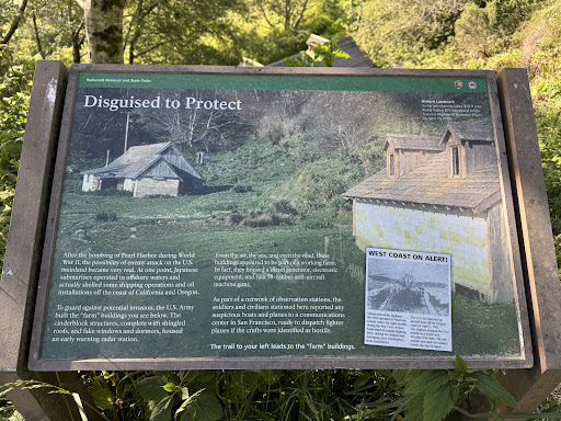 Read moreIt was an eerie day as we made our way up the coast and a wonderful volunteer a Redwood State Park told us about these WWII radar stations. Other than a plaque at the top of the hill however, there isn't much info there. Would be great if they had pictures on the outer walls of the buildings showing what it used to look like inside with the operators on...