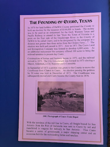 Great small town museum with interesting exhibits showcase in the history of the town. CUERO is a very interesting and old place. With cool traditions. Actually known as leather in Spanish it’s not necessarily the leather capital of the world like Yoakum. Young lady gave us a nice tour and explained many of the turkey trot traditions along with some of the Ferg trappers experiences and the reason for several of the different exhibits that also include Japanese porcelain and China. Ottoman history is steeping inside of this little town with a crazy and interesting back story, pens all the royal dresses and palace decorations!...