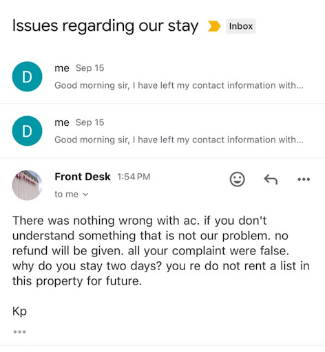 So we went downstairs to speak to the man he told us that we signed a paper saying no guests which wasn’t true since I booked online and it just said a double room. He continued to speak to my fiancé staring at me talking about me. As a woman I found that extremely disrespectful.