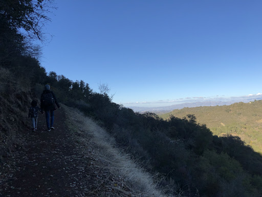 From the vista point at the top, there's a view (partially obstructed by trees) of the South and East Bay. The descent down the more open trail is pretty steep and gravelly, so be careful! (It's not the only available path down though.)