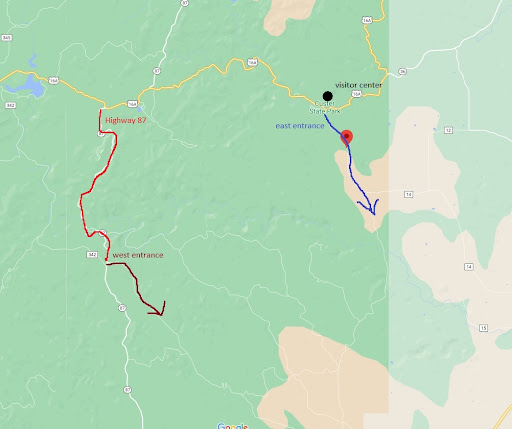 This is the lesson that I learned. We followed Google Maps, missed turning south from Hwy 16A into Hwy 87, and eventually entered the loop from the east entrance. This wasted a lot of time! I hope you won't repeat...