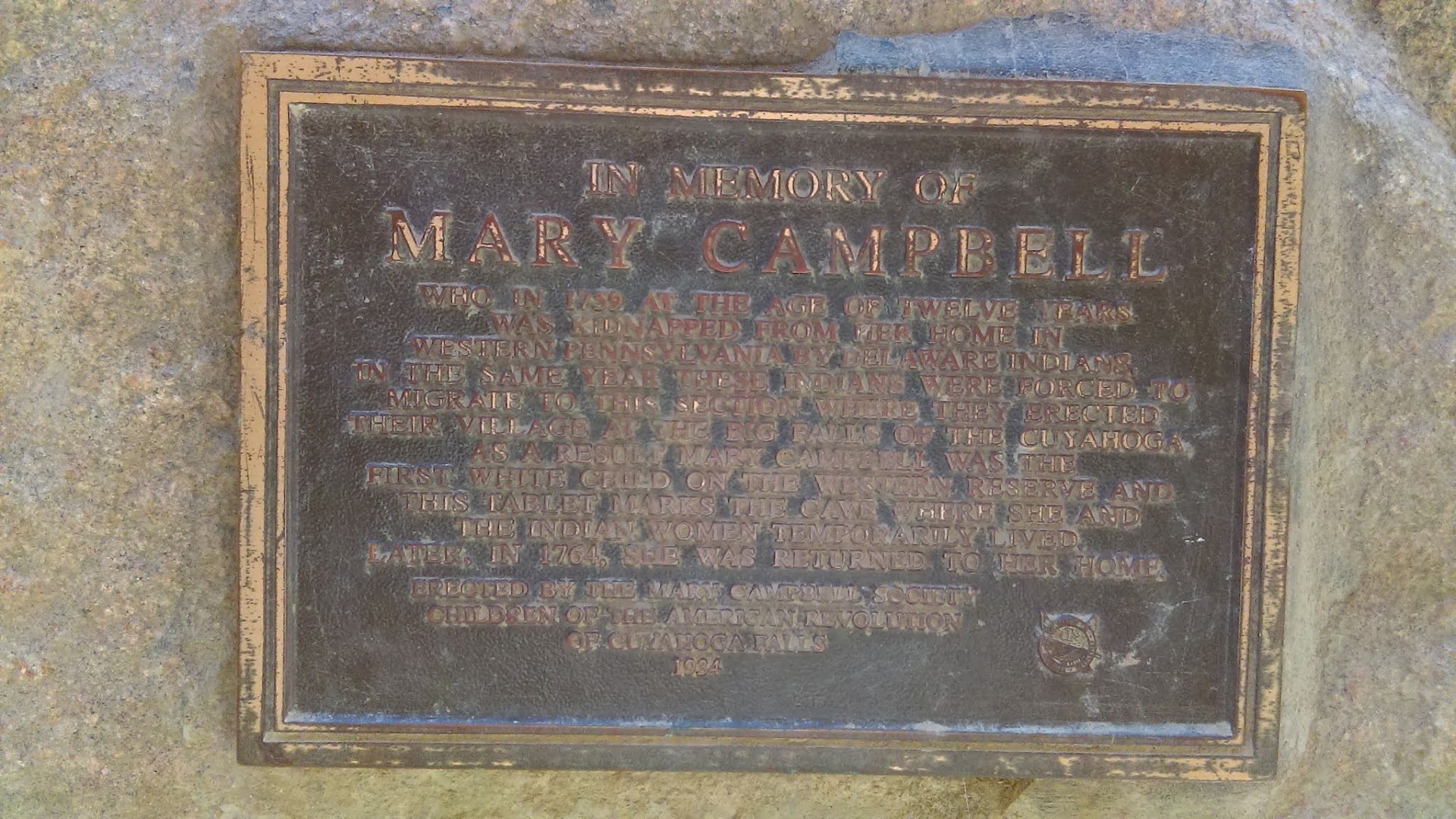 Who in 1759 at the age of twelve years was kidnapped from her home in Western Pennsylvania by Delaware Indians. In the same year these Indians were forced to migrate to this section where they erected their village at the big falls of the Cuyahoga. As a result Mary Campbell was the first white child on the Western Reserve and this tablet marks the cave where she and the Indian women temporarily lived. Later, in 1764, she was returned to her home.