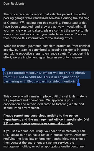 At this point, I really can't say anything negative that is a reflection of negligence of managements end. There are things in any complex or neighborhood that you just can't control and I personally have become more mindful of that when it comes to complaining about menial things. If something is truly a nuisance, it will be resolved in proper timing.