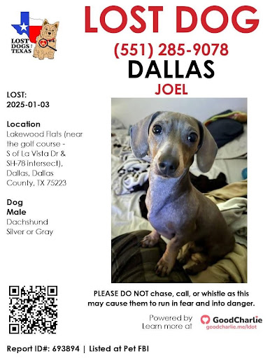 Please help me find my dog, Joel! He is a 1-year-and-5-month-old grey and tan Dachshund, weighing 11 lbs. Joel ran out of our home on 01/03/25 near Tides at lakewood and Lakewood Flats, Dallas, Texas 75223, close to the golf course.