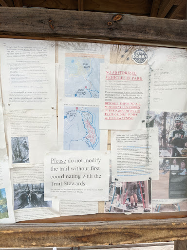 This is a nice small area with a few trails that are all pretty well marked. The trails have improved quite a bit from when I was last here, and the trail had has a bike stand with bike tools for quick repairs & adjustments. Many new wooden features, and escape routes for some that weren't there before. Most of the trails are in shade from tree cover, but the backside does have some sun exposed areas... just ride faster through those. Blue has the most variation in my opinion, but all are fun. Red can get you into doing laps. Some tight trees in spots (750mm bars), a few loose dirt corners and it's not just a simple cruise. In Texas heat, not even a few laps & you'll be dripping sweat. I really like the brick & stone pavers that were added in places where it used to get nasty muddy. Some of the vegetation needs to be cut back... there are several face slappers on the trail...so keep your eyes open,...