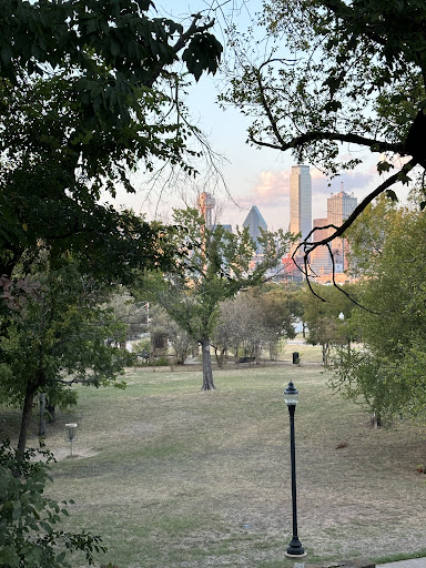 There's a small parking lot, then hilly woods and a thicket that helps muffle the sound of busy streets. There were at least a half-dozen people playing disc golf. A paved pathway rolls across it to an open area with an unobstructed view downtown Dallas.
