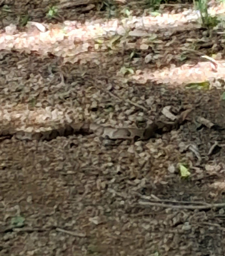 However beware the venomous snakes, there are Copperheads and apparently Cottonmouths that frequent the area. We saw the first on our hike in, a pretty good sized one at that, but didn't see the latter. I believe the other reviewers about the Cottonmouths though, with the shady creek hugging the trail and the pond just down the way it's the perfect place for them. If you are bringing kids or dogs keep them very close to you, don't stare at your phone or get distracted from what's in front of your feet for too long, and stay on the trail. Copperheads blend in well with the trail, especially near sunset, and they strike fast. Have fun and be safe.