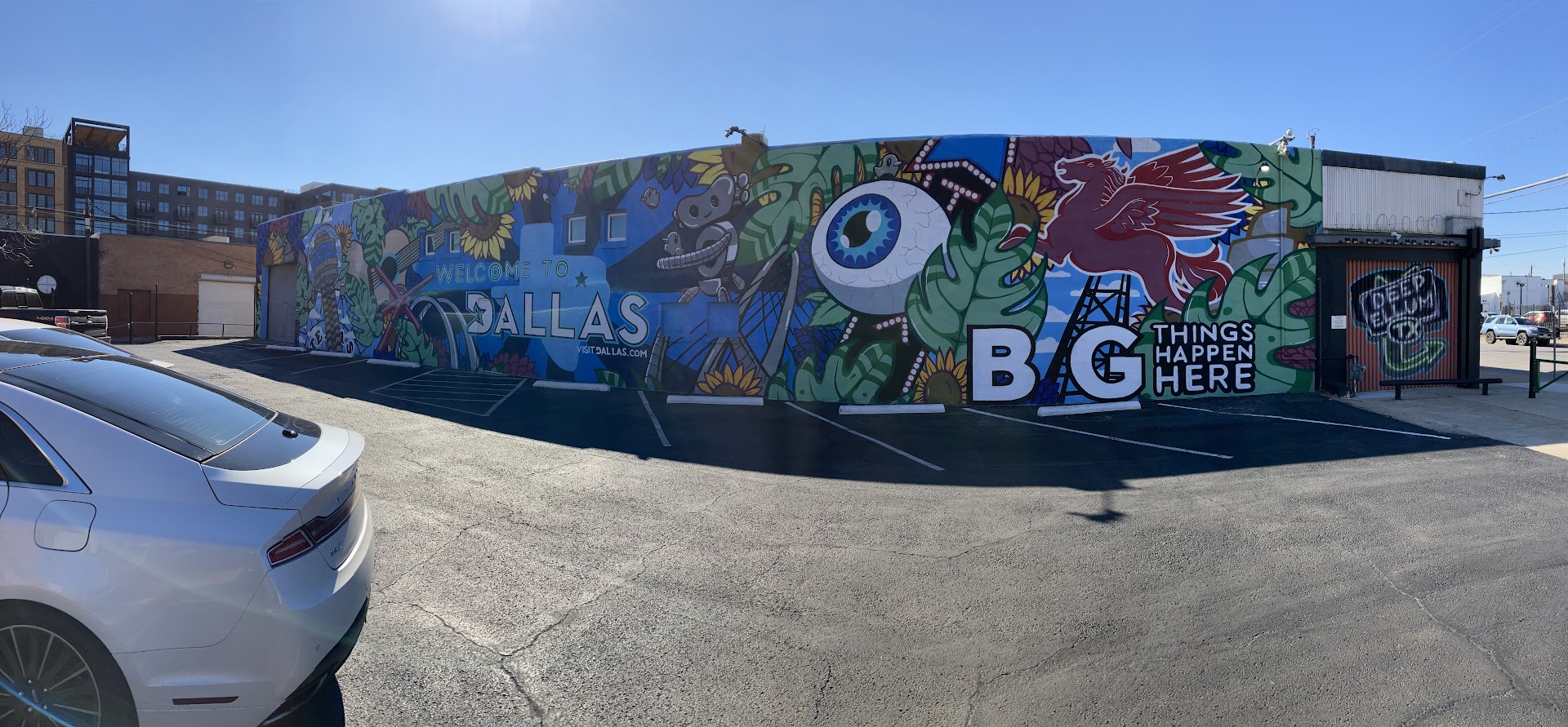 If you are visiting Dallas, do not miss the opportunity to take a photo with the VisitDallas Mural. It is located in the beautifully artistic Deep Ellum area. It is created by mural painters Tex & Sergio. This incredible mural features some of the most well-known spots in Dallas - Reunion Tower, Pegasus at the Omni, Traveling Man, Giant Eyeball, Margaret McDermott Bridge, and Margaret Hunt Hill Bridge. The mural is just in front of a parking lot, so you don't have to think about parking. The only cons is there are parking spaces with the mural and if someone parks there, it can ruin your photo. We were lucky since nobody...
