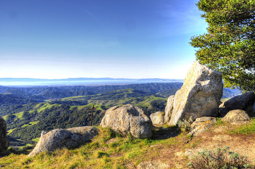 Started hiking here over forty years ago and still love this place. Park in the parking lot at the very end of Bollinger Canyon and you'll notice the paved trail (closed service road) that leads to the top. This road is about a mile long and rises in elevation approximately 1000'. The road leads to a an antenna site that sits on the top of the ridge. About a 100 yards to the west, across open fields, is a second ridge from which you can see San Francisco Bay and the skyscrapers in downtown San Francisco. Tremendous views all around. If your'e still up for a bit more hiking head south from the antenna site, going parallel to the ridge to the west. As you hike south, along a dirt road through open meadows, you'll notice that the ridge to the west drops off sharply and then rises rapidly again. On this second section of ridge, which has lots of trees, there are also many exposed rock formations. In one of these rocky sections is a small sandstone cave that is open to the east but also has a "window"...