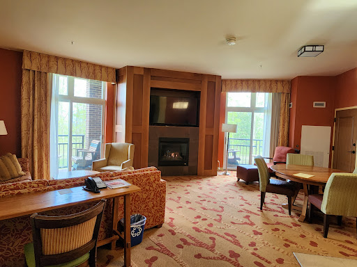 We have splurged for the King Suite which has two rooms. A King bedroom with a balcony, desk, mini-fridge, microwave, individual cup coffee maker, and bathroom. The nice, big second room has a gas fireplace, sectional sofa that also is a pull-out bed for the kids or another guest, wooden eating table with four chairs pus an additional leaf in the closet, and a wet bar (sink, microwave, and another refrigerator), and desk. The room has a connecting door if you needed to book another bedroom. The living room wet bar has a full size coffee maker (each filter makes 3 - 4 cups). Black tea is provided for both the living room coffee maker and the individual coffee maker in the bedroom. Each room has separate climate controls which worked well, although I found the bedroom heating to be noisy.