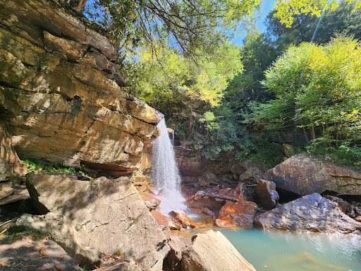 Absolutely beautiful waterfall. Unfortunately the river is also absolutely dead. The water (and rocks) are heavily discolored and polluted by acid mine drainage. You should not get in this water, even briefly. The only thing living in this water is extrenophile bacteria and algae.