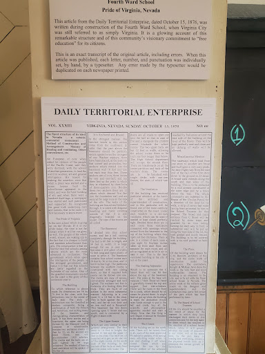 Read moreThe best place in VC for a great history lesson. Covers everything from the school itself, Mark Twain & printing, mining & minerals, Comstock history, 110 years of local school alumni, and a changing exhibit that always features something very interesting. If there's only time to visit 1 place in V C for your history lesson from knowledgeable & friendly folks this is it! Not to mention the museum is housed inside an authentic historic school from 1876. The beauty of the building itself is enough reason to stop...
