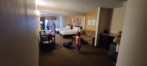 The room was huge!! Like wow! We had a 2 queen suite with a pull out sofa. It worked like a charm to fit 2 adults and 4 kids.... something that is very hard to book! Most hotels only allow 5 guests even with the same type of rooms. There was a TV, desk, armoire, microwave, mini fridge, extra counter space with more cabinets, and for the bathroom/shower it had a pocket door which saved space in the room design. Sink is outside the bathroom/shower which was soo helpful as one was going to the bathroom, another could brush teeth or use the sink.