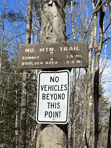 A few parking spaces at the trailhead. Actual trail starts off with a nice gentle slope and is easy to follow. A little more than a mile in though you reach a triangle intersection where the trail seems to split. If you are looking for the north mountain trail or even the bypass best to go right for just a few steps and your options become more obvious. There are a few distance signs and you can spot the white diamond blazes that take you steeply up towards the summit. If you had gone left the path is wider and seems more obvious but that direction quickly seems to take you out of the state park area and into...