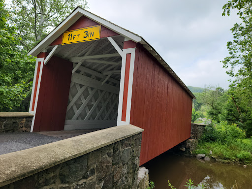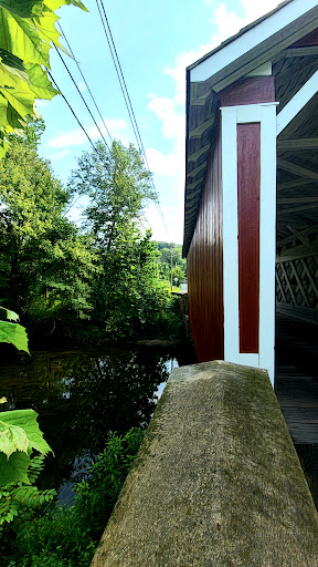A beautiful and well-maintained covered span in an idyllic spot. Just be careful taking photos or just walking across it to admire its beauty because the local traffic flies over this bridge like it's not even there. I had to press myself against the inside wall as a car that I didn't hear coming drove through at what I'll say was about 45 MPH. The driver spotted me at the last second and nearly jump-scared his car into the lead-up. He didn't stop. Kept going. I then watched a line of cars rip through it from the other direction just as fast. It's a covered bridge, people, not an EasyPass toll booth. 15, maybe 20...