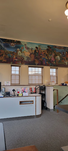 This is one of the smallest Denver Library branches, but the building is a gem with gorgeous architectural details inside and out. It is a Carnegie library, constructed in 1918 by father and son architects, Varian & Varian. The style is Spanish eclectic with brick, stone, and painted concrete. The exterior window details and main entrance with highly-decorated arches and columns plus the gabled, tile roof provide a very impressive facade. The interior is a single room with vaulted ceilings, a fireplace, and a mural by Carlota Espinoza (Pasado, Presente, Futuro). The building was restored in 2020-2021 and is in fine condition.