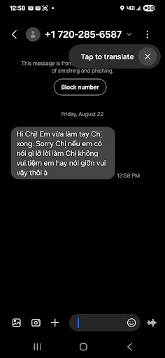 Here is a screenshot of Jasmine texting me after I left to apologize but also acting dumb and ask what she did wrong? To help translate as it is in vietnamese, she said she was "joking." I heard no laughter after any of her rude remarks. There are so many other nail salons. I will spend my money where I feel respected and the owner cares about customer satisfaction. Good nail techs will give recommendations base on what the customer wants vs for their own benefit of being lazy to do what the customer came in for and to make...