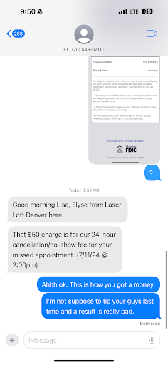 SUPER unprofessional experience. I initially liked Laser Loft and had been setting up appointments every six months. But after being confronted in such a way by someone who claims to be a professional, I will not...