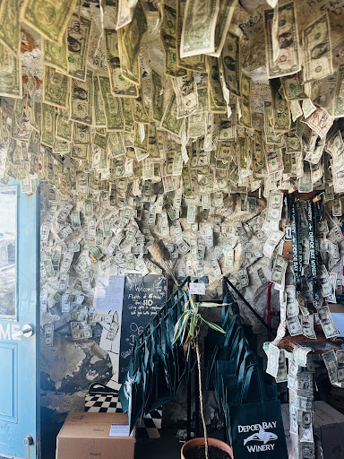 We stopped by last Thursday, 5/9 in the afternoon. First, the tasting room is very small. The floor is sloped and uneven. The ceiling is too low and the dollars hanging from the ceiling hit your head if you are 6' tall or more. I am 6' and my friend at 6'5" could only stand in a few spots. Further, please get rid of the Covid-19 glass window relic that separates the customers from the area behind the bar. It is ugly and just reminds people of the pandemic!