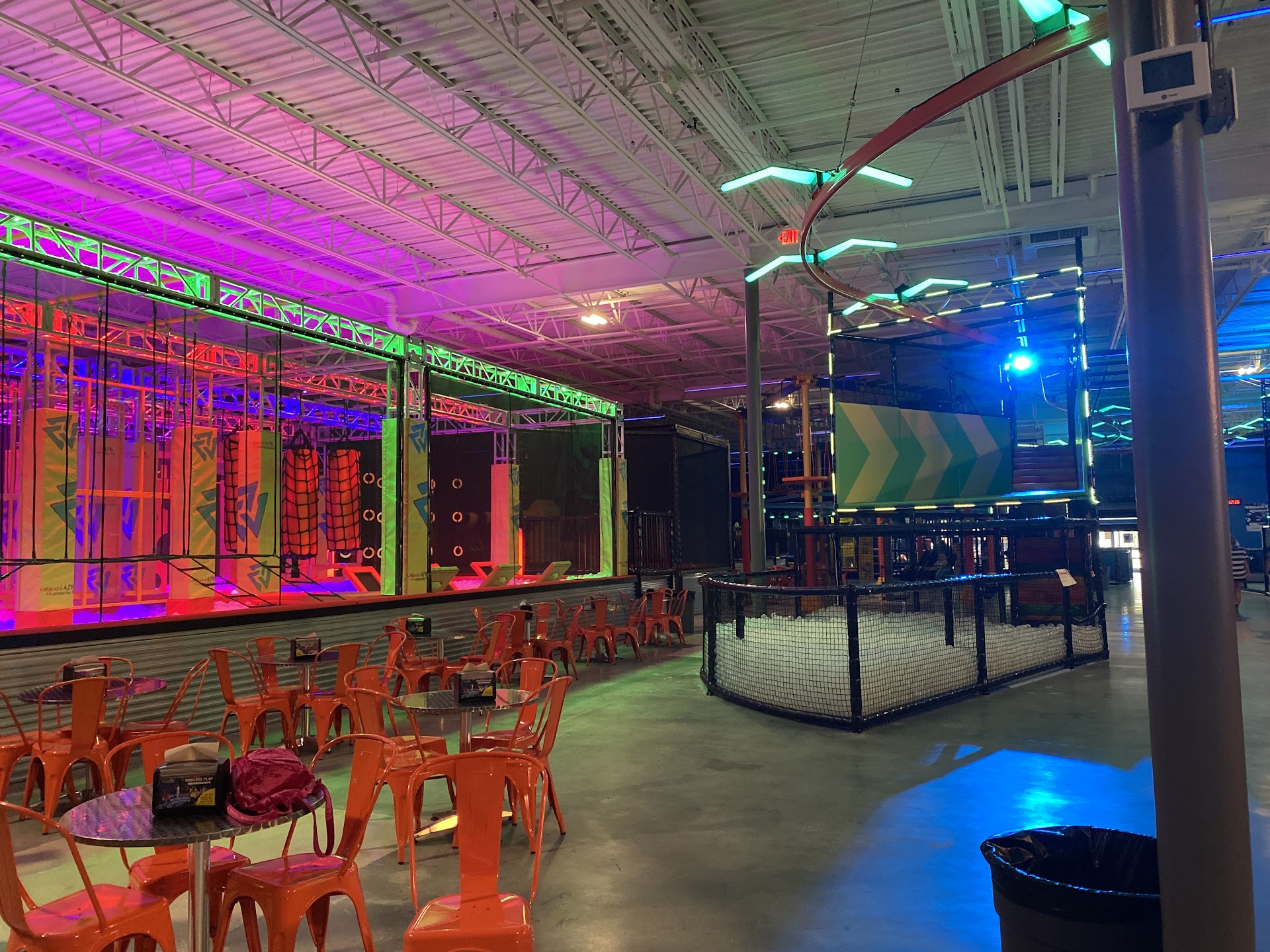 Environment- Inside is low lighting, as the lighting changes from black to pink lights. Urban Air was advertising future glow parties, which really excited the kids. It was incredibly spacious and the layout was easy to navigate. Did not have trouble with crowds. The Café had numerous sodas, pizza, snacks, even beer and wine for those old enough to order.