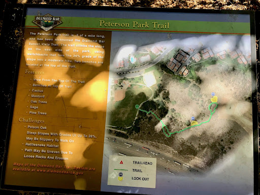 But... if you're looking for fun, short nature trails, the one here probably isn't one of them. The Peterson Park Trail is definitely short—it's a 0.2-mile out-and-back trail. However, it is steep with loose gravel, and the latter half of the trail is overgrown from probably not enough use. As of the time of this review, the path after the first lookout area is completely overgrown with tall dry grass and weeds. The "trailhead" is hidden under the trees. There is supposedly poison oak growing here, so I did not attempt to...