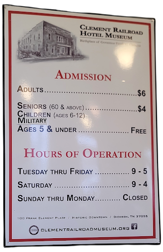 I visited the Clement Railroad Hotel Museum on June 1, 2024, with my brother and sister. The three of us (from Connecticut) had just flown to Nashville and driven straight to Dickson. This was our first time in Tennessee, and the CRHM was our first destination.