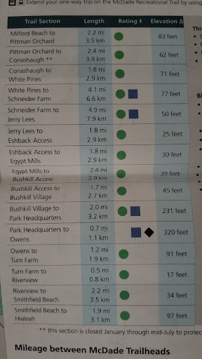 Great trail for bike riding with the following caveat. The Hialeah to Smithfield section (see attached photo) is NOT easy. We stopped at the Visitor Center to get this map/guidebook and get a recommendation on which section we could bike with the kids... Disregard what this map tells you regarding the rating and the elevation delta (at least for this section). The elevation delta must be only the difference between the start and end points, disregarding any gain/loss between these points (see google maps screenshot). There are two very large descents/climbs that required some/all of us to walk our bikes down/up. The gravel on much of this section was mostly larger which posed an additional challenge for a hybrid bike rider and was still challenging on a MTB. Based on this, it makes me question the legitimacy of the other ratings...