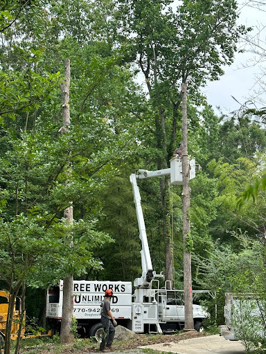 Read moreI had a tall pine tree next to my house that needed removal, so I looked up various reviews on local tree removal companies. I found Robert and Tree Works Unlimited, and they exceeded my expectations. During his initial visit, Robert explained in detail what the tree removal process would be; the safety precautions that would be in place and anything to keep in mind before/during the job. I could tell that he knew exactly what he was talking about from experience and not just using buzz words to appear more knowledgeable and trustworthy. When the scheduled day arrived the crew showed up precisely on time and got straight to work. They did not simply climb the tree and carelessly cut off large/heavy branches just to have them fall somewhere below like a previous company did. Robert himself was in a bucket truck, cutting and roping off limbs to strategically (and safely) lower them down to the workers below who disposed of the pieces and cleaned up any debris. They placed matts on the ground when the Bobcat was needed to prevent the lawn from getting ruined by the tracks. Everyone had safety gear on the whole time and were constantly communicating with each other. As Robert promised on his initial visit, they left behind no evidence that a tree was there (aside from the stump). All branches and pine needles were gone.