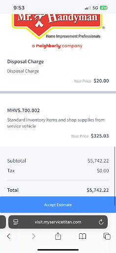 One star. Very nice people. Showed up on time. Needed my garage door headers replaced/fixed. My written estimate was for $625 labor and $200 estimated material charge for a total of $825. The person that came out to look and take pictures said they would replace one header and fix the other if necessary. The bill I received from the one person who did the work was $1569.38. Neither header was replaced. I did not like the work that was done and did not pay the bill or sign that I was satisfied with the work. I discussed the situation with the person in charge when he returned the following week. He assured me they would come back and do what needed to be done to make me happy. I was glad to hear that and asked for a copy of the bill. I later received a copy of the estimate. When I called the company they assured me I would get an email with the bill. They called back later to tell me they had sent the bill and to set up a time for the work and requested I pay in full prior to their return. I sent an email explaining what I would pay immediately and assured them I would pay in full upon completion of the job. They never responded to the email. The technician did show up promptly and performed the rework. The supervisor also showed up. I paid him at the end of the day. The work is unsatisfactory. I will not ask them to come back. They do not know how to fix the issue. One header should have been replaced entirely. This takes more than one person. They charged $125 per hour. I assumed there would be at least two people. I still have to have the issue addressed but $1500 is not the kind of money you go to court over. I have decided to move on. This company is just what it says it is, Handyman. Good for small jobs. Do...