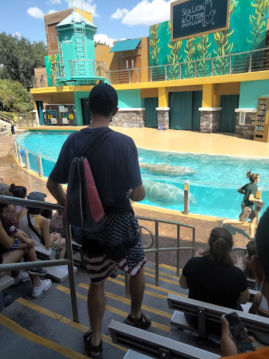 The stadium is located inside SeaWorld Orlando. I suggest getting there 20-30 min before a show starts. The first ten or so rows are considered splash zones but really the middle splash zone gets the most water. The water sprays out of the 3 holes at the top of the walls on stage. This happens 2-3 times during the show. The show features 2 seals, an otter and a walrus. Just recently the show theme changed from Bayside high school to a research institute. The core animal stunts are the same if you are familiar with the show from years past. I was presently surprised they change it a...