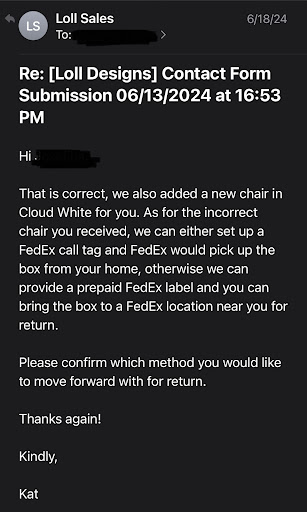 Here's a breakdown of the issues I encountered: June 12th: Instead of receiving the chairs as ordered, I received one grey chair and one of the packages was damaged upon arrival. June 13th: I promptly emailed Loll Designs Inc. to report the damaged parts and the fact that one chair was the incorrect color (grey instead of white). June 14th: I provided photos of the damaged parts as requested by Kat from Loll Designs Inc. She assured me they could rush a replacement chair early the following week and arranged for FedEx to pick up the incorrect chair. June 18th: I received communication from Loll Designs Inc. stating that replacement parts were being processed with an estimated ship date of June 21st. They also mentioned they would include a new chair in Cloud White. June 20th: FedEx finally picked up the incorrect chair. June 25th: Today, I received the replacement parts, but to my dismay, there was still no white chair. I followed up via email immediately, attaching the image of the work order placed on June 18th, and requested a refund due to the ongoing errors and the considerable inconvenience caused.