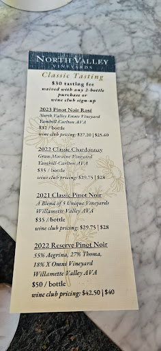 Read moreNorth Valley is a "home away from home" destination that can't be missed. The cozy log cabin is the perfect setting for their seated tasting, which includes Chardonnay, Rose and various Pinot Noir's depending on the time of year. I really can't compliment the staff enough - they are truly passionate about wine and sharing their sustainable story, from bud break to bottle. The stunning views round off a one of a kind experience. Cheers to the Soter's - you've...