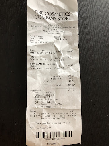 Read moreI had an extremely poor service at this branch yesterday. I came to return and exchange a make up remover âTake the day offâ from Clinique because it was too oily and I was getting a rash. Sales representative was so upset with my request and without looking at my receipt she said that she wouldnât return it because the product looks frozen. I explained to her that it was in my backpack and it got shaken, not frozen since it was 35F outside. Then she switched to her next argument which is that they donât give returns and exchanges since it was a final sale. I showed her my receipt and was trying to explain that it wasnât a final sale item and if it was it should have had a red stamp that says so. Also, on the receipt it says returns accepted for exchange or store credit only, but she replied that she can read english and it doesnât matter what it says on the receipt. I asked her name and she wrote it on my back of receipt, but the name she wrote down didnât match her name tag and I asked why she wrote a completely different name. She said that her apron was dirty, so that she put on somebodyâs apron. I assumed that she was trying to get out of responsibility by blaming somebody else. Her name on the name tag was Jenn and on attached photo you can see what she wrote. I called her a liar and she was so upset and told me to go to the Albertville outlet to return my item since I bought from there and thatâs about 2 hours of driving from there. Extremely...