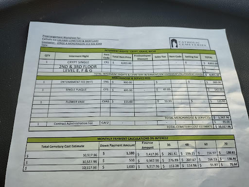 Read moreI have my grandfather on Hospice care. I called this facility twice last week and spoke with the same representative. I advised her that my grandfather had prepaid his services there with them years ago. I provided his name and all the information I had. I was advised that they did not have any record of his prepaid service nor of my grandmas mortuary service we had with them 14 years ago. I called back twice and was told the same thing. I begged them for their help and was given " I already spoke with you yesterday we don't have your grandfather listed here." Finally I found papers from 17 years ago receipts confirming the prepayment of services arranged in good faith with Calvary and my grandfather. I called Calvary and giving them only my grandfathers name no more than the information I provided them last week I told them " I have documentation confirming prepayment of services when can i set an appointment to bring this documentation to you." They advised they would call me back and the moment they called me back they confirmed that my grandfather did prepay his services. What was different then from when I called last week? I have never felt more shammed. their unwillingness to help and be so cold to a family in their moment of need and in this business is cruel. I hope when my grandfathers time does come and we have the services at Calvary we have a more professional and empathetic experience. I spoke with the director of the facility and as kind as helpful as she was trying to rectify the situation does not undue to stress her staff and facility...