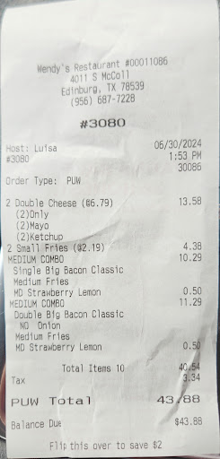 Read moreI love the apple, pecan salad with a large chili. I am picky and do not like the cheese nor grilled chicken so I ask without the cheese and breaded chicken as recommended by the manager at Wendy's North McAllen. Sometimes I get the bothered look by staff but I still go. You need to make sure they don't forget the pecans or the crackers and they also forget the spoon for chili. Believe me it's no fun trying to eat chili with a fork. All that aside it's not Wendy's fault, it's the...