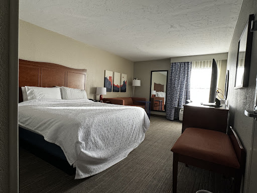 Read moreI selected this hotel because I’m a Hilton Honors member and it is at a nice location in El Paso… Although the Marriott next-door looked like a nicer property, I was counting on my Hilton Honors experience for this to be a good stay…I was wrong. The rooms are older and not kept up well. There are stains in the bathroom and on the walls that could have been tidied up. The caulking in the bathroom is in bad need of repair. The linens were very wrinkled, and I was not confident in their cleanliness. I have a king suite and it is parsley decorated. I guess I am more accustomed to Hilton Garden Inn, decor, and amenities but, I did not expect the Hampton Inn to be so different…|After staying the first night, I decided to update this review to take notice of the shower: there was no bath mat, only two towels and, most disturbingly, there was hair in the shower… Lots of hair in the corners… The shower had obviously not been cleaned…|Also two of the towels had holes in them… There’s no place to post photos here, but I will add another review site.|The front desk staff young lady that we encountered was not friendly like other Hilton staff whom I have encountered. Granted, I’m in Texas and I’m used to traveling on the East Coast but… I just assumed the Texas hospitality would be kinder. This particular front desk clerk was indifferent and snarky. Of note, there is apparently no benefit to being a Hilton Honors member at this hotel. I have been a Hilton Honors member for 20+ years and always have had exceptional service. Not at this property. I will not be...