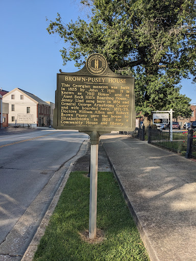 The marker out front reads, "This Georgian mansion was built in 1825 by John Y. Hill. It is known as "Hill House" and as "Aunt Beck Hill's Boarding House." Jenny Lind sang here in 1851 and General George Armstrong Custer and wife boarded here, 1871-73. Doctors William Allen and Robert Brown Pusey gave the house to Elizabethtown in 1923 for a Community House...