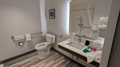 Pros: Room was comfortable and spacious, very easy to maneuver the wheelchair in. This particular room has a roll-in shower, and you get a nice, full strength stream of water (so many other hotels have water-saving devices where the stream is fairly weak). Also, the bathroom has a nightlight. At other hotels, I usually have to leave the bathroom light or entry-way light on so I can find my way to the bathroom in the middle of the night without bumping into anything, but the nightlight in the bathroom cast just enough light for me to see.