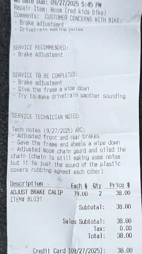 This week, I brought in my S-Works Tarmac SL6 for a tune-up. I specifically asked for Austin to do the work and mentioned that a firmware update was needed because the rear derailleur was skipping a gear. I was assured both requests could be handled. However, when I picked up the bike, Austin had not worked on it, the firmware hadnât been updated, the gear was still skipping, the chain had not been cleaned, and the brakes were untouched. It left me wondering what was actually included in the tune-up service. I did point out the firmware/gear issue before leaving, and they did take care of it.
