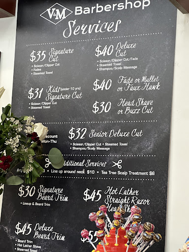 I hesitate to write the review I have in mind because I selfishly dread the possibility of long wait times or difficulty getting an appointment. Both of which became problems at the last place this talented new owner was excercising her skill. More importantly though, I feel an obligation to my fellow citizens of Encinitas and the Noth County to point out an excellent new business in Encinitas called V&M Barbershop. Vickie is the owner and main barber who has recently taken the leap to move beyond her former status as Premier Stylist at another company to now become an owner/operator as well. Always cheerful and welcoming, Vickie had cut my hair previously for almost 2 years and I was quite pleased that she decided to open her own place AND kept it local, so that I could continue receiving the experience I had to come to anticipate each month as my hair got longer and more annoying. The experience begins with a very meticulous haircut which is careful and precise to your specifications without ever becoming long, tedious or annoying as haircuts can at some shops. I always feel like I get my money’s worth both in the final product (my haircut) and in the time and effort she puts in. Vickie is a true professional. Many young stylists seem to have been taught to cut hair by rote (One, cut the sides and back with buzzers, two, blend in with scissors, three your basically done). Vickie has a much more sophisticated style which reflects her international training and experience. One option she offers in addition to hair cutting is one of the most relaxing head and scalp massage/shampoo that you can imagine. Beginning with a nice steamed towel on your face, she soon starts gently massaging the shampoo into your hair. Her hands are magical. Strong but gentle, you become putty in her hands as she works the shampoo into your hair. Believe me, the aroma, the warm water and her hands at work together combine to nearly put you into that light dreamy almost sleeping state. She also offers straight razor shaves for the face and for the neck. That’s a classy way to finish a haircut! Last but not least the prices are reasonable. I don’t want to see them charge any less because like I said I’m selfish and don’t want to see a bunch of kids in there, but it is not as costly as you might think. So do yourself a favor men and treat yourself for once to little bit of heaven. You will leave relaxed, happy and with a clean...