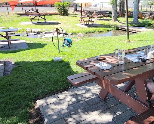 Indoor seating included several tables under a covered porch and plenty of outdoor seating with umbrellas on a grassy lawn. It was a cloudy day but most outdoor tables were occupied - clearly a popular place. Establishment had beautiful grounds, with flowers on the back porch & throughout. Even the building was brightly painted; everything about this place was cheery & inviting.