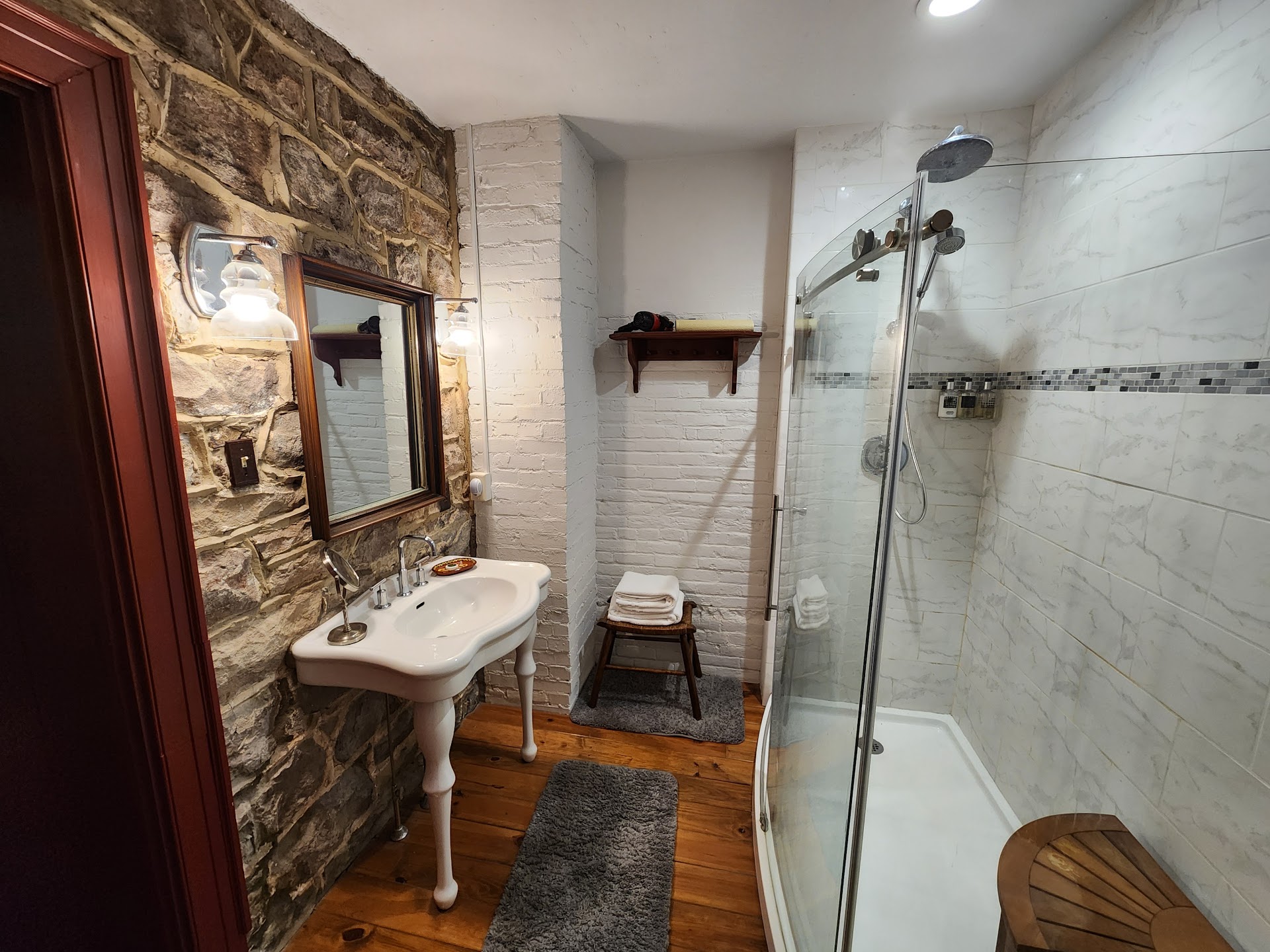 The part that surprised me is that the owners were not expecting us and they were not prepared because we booked for the following night! Fortunately they were able to give us the last available room and greeted us with happy surprise. The Inn was clean, free of dust and smell, simple yet thoughtful decor and yet kept to period. We stayed in the Yellow room, which had a queen four poster bed and a new shower. And the shower!!! was so modern, surround with glass on two sides and subway tile with dark gray grout set at 1/4" apart, lovely. A large pedestal sink and original floorboards throughout the room. The liquid soap was a wonderful, refreshing smell.