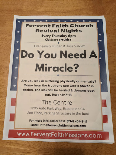 How this place could allow an organization that claims to cure people who suffer physically or emotionally (through mental health disorders) is an absolute shame and hurtful to people who are actually dealing with real medical issues. The organization, Fervent Faith Missions, seems to be claiming that they do faith healings based on a flyer left at my door in my complex (trespassing, mind you) when our signs say otherwise. This is harmful and I hope you reconsider letting, in my opinion, these charlatans from...