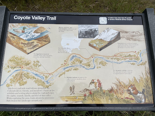 Read moreCoyote Valley Trail is a great option if you’re coming into Rocky Mountain National Park from the west entrance. Easy trail to start out with. The path is flat, about a couple miles round trip, and follows the Upper Colorado River through open meadows with mountain views in the distance. It’s fully accessible and has benches and picnic tables along the way.